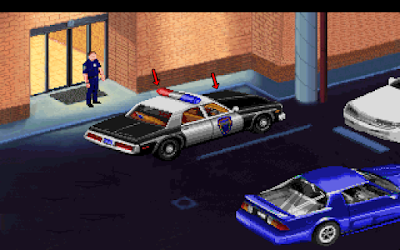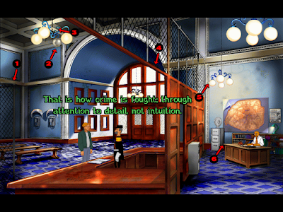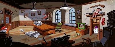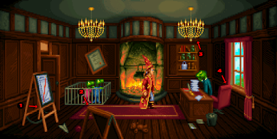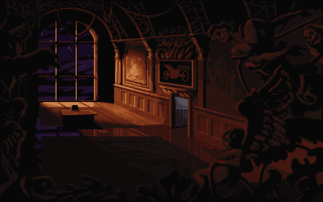 Another Gabriel Knight scene, this time with objects in the foreground, rather than the background, being lit on the edge. Here the left side shows various objects that have been lit this way, and as they move further and further out of the focal area of the scene (and 'away' from the light source shown by the glass door) the effect is less and less strong. This adds nice definition to the objects without having to colour them in a way that would be distracting, and is a nice way to add some subtle purple colours into this part of the scene, without being as distracting as the purple candle in the bottom right.